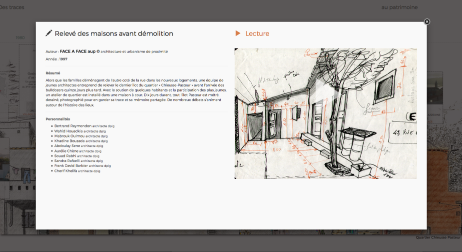 Cet équipement multimédia présente le travail de collecte autour de l’intitulé : Travailler et habiter à l’Estaque, restituant l’histoire et la mémoire du quartier Chieusse-Pasteur à l’Estaque, qualifié de bidonville par la ville de Marseille, mais dont plusieurs urbanistes et architectes se sont attachés à reconnaître les qualités d’habitats auto-construits ayant plutôt à voir avec les habitations traditionnelles kabyles : cour intérieure, lieux de vies extérieurs partagés, similitudes avec les médinas...