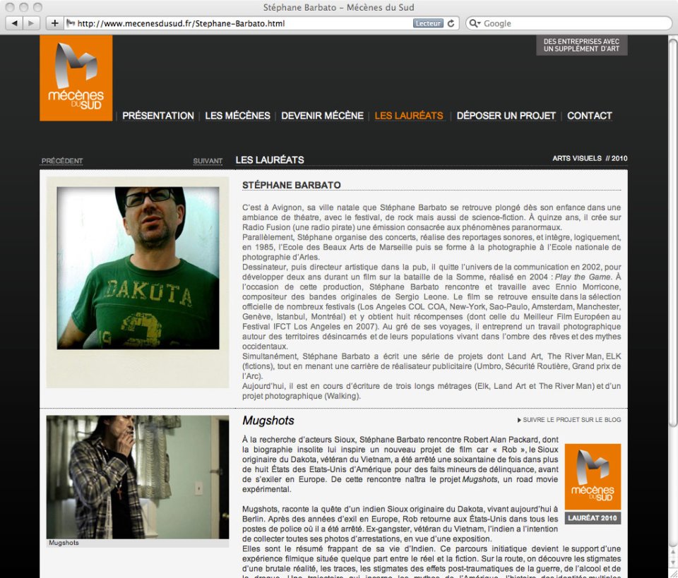Création du site de l’association Mécènes du Sud, collectif d’entreprises de Marseille-Provence œuvrant à la promotion et au soutien de la création contemporaine. Présentation des mécènes, des lauréats et des projets soutenus. Diaporamas jquery avec Gallery View. Envoi mensuel d’une lettre d’information avec SPIP-Lettres.